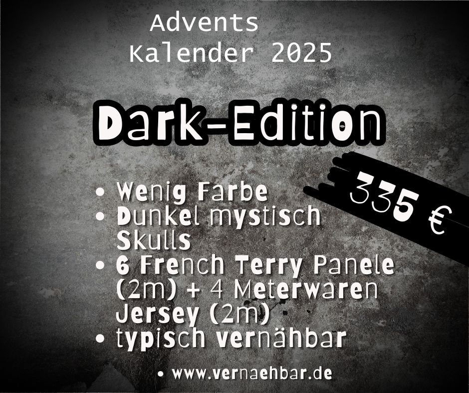 Lass dich von unserem exklusiven Dark Edition Adventskalender verzaubern. Hinter jedem der 10 Türchen erwartet dich ein wahrer Schatz: Enthalten sind 6x 2 Meter lange Stoffpanele (French Terry) sowie 4x Meterware à 2 m (Jersey), kunstvoll gestaltet mit düsteren Motiven. Ob Skulls, mystische Themen oder geheimnisvolle Welten – jedes Panel ist ein exklusives Design. Die hochwertige Stoffqualität und die reduzierte Farbpalette unterstreichen den dunklen Charakter dieser limitierten Edition. Perfekt für alle, die es besonders düster lieben.