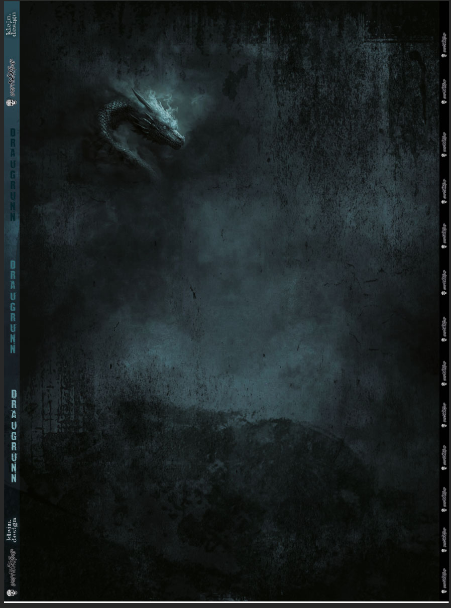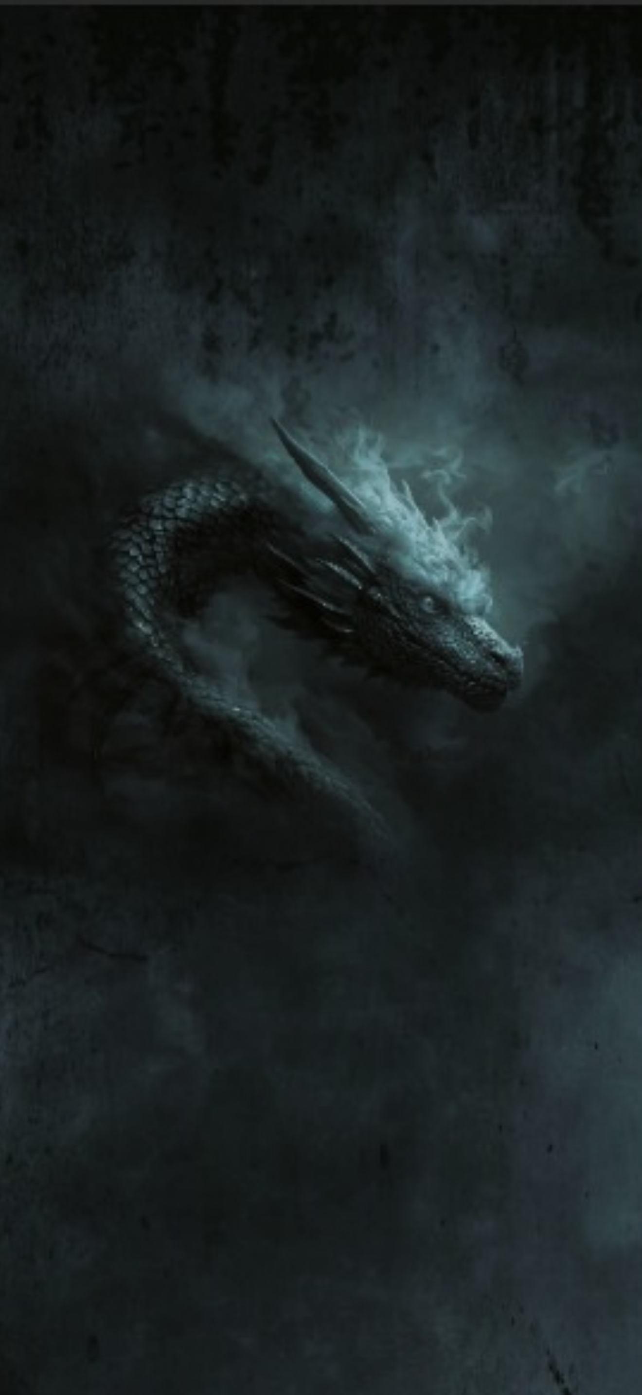 Am oberen Rand taucht schemenhaft ein mächtiger Drache aus dem Dunst auf. Seine Silhouette wirkt zugleich elegant und bedrohlich – ein stiller Wächter, halb verborgen, halb enthüllt. Die texturierte, fast verwittert wirkende Oberfläche verleiht dem Design eine rohe, mystische Tiefe.