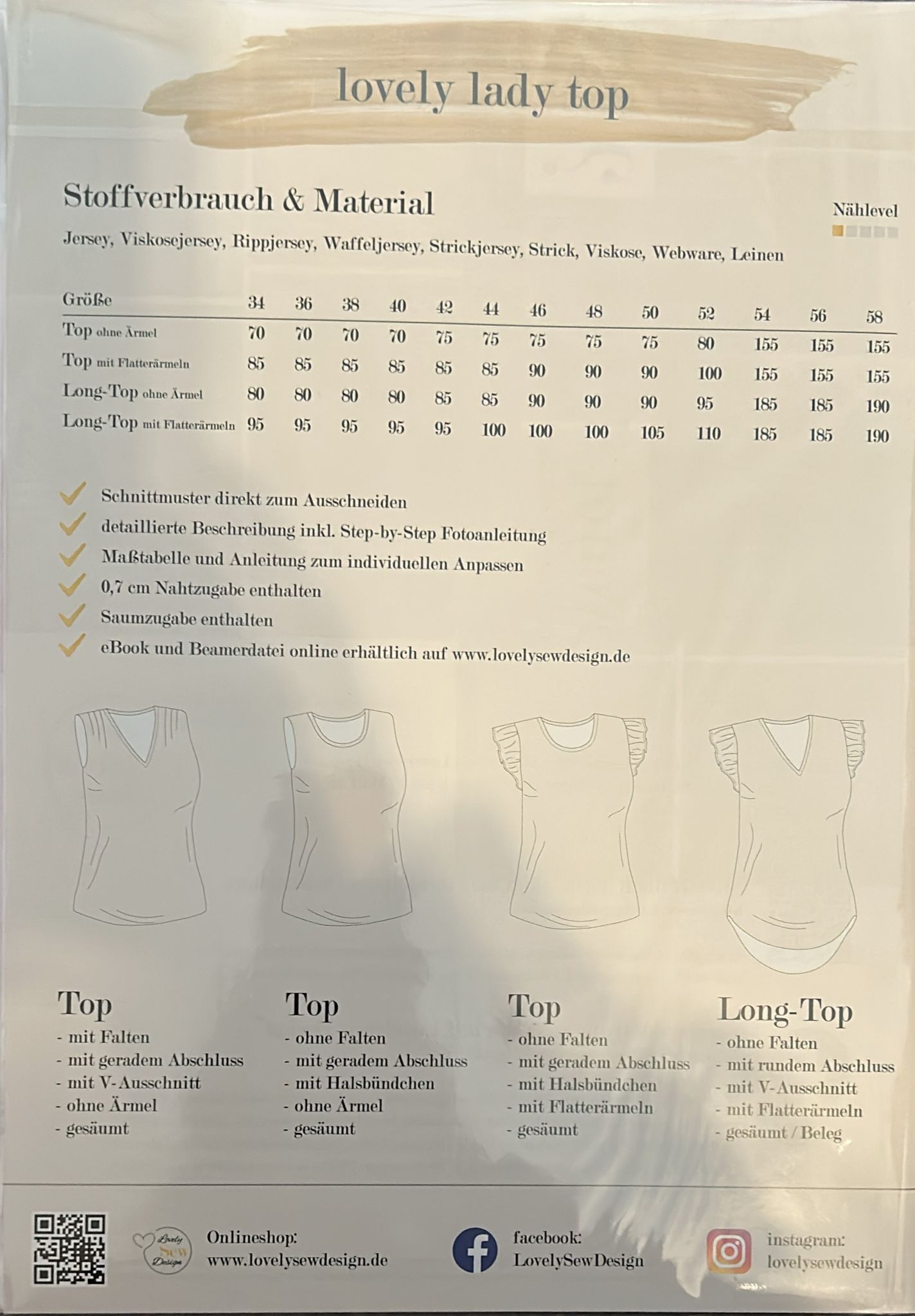 Es kann mit dehnbaren & nicht dehnbaren Stoffen genäht werden. Musselin ist nur für erfahrene Näherinnen zu empfehlen.