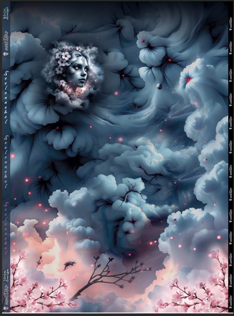 Im Fokus steht ein geheimnisvolles Gesicht, umrahmt von Blüten und Nebel. Kühles Blau trifft auf schimmernde Rosa- und Pinkakzente, die wie leuchtende Partikel durch die Komposition tanzen. Das Zusammenspiel aus Tiefe, Bewegung und Farbe erzeugt eine ruhige, verträumte, fast mystische Stimmung.
