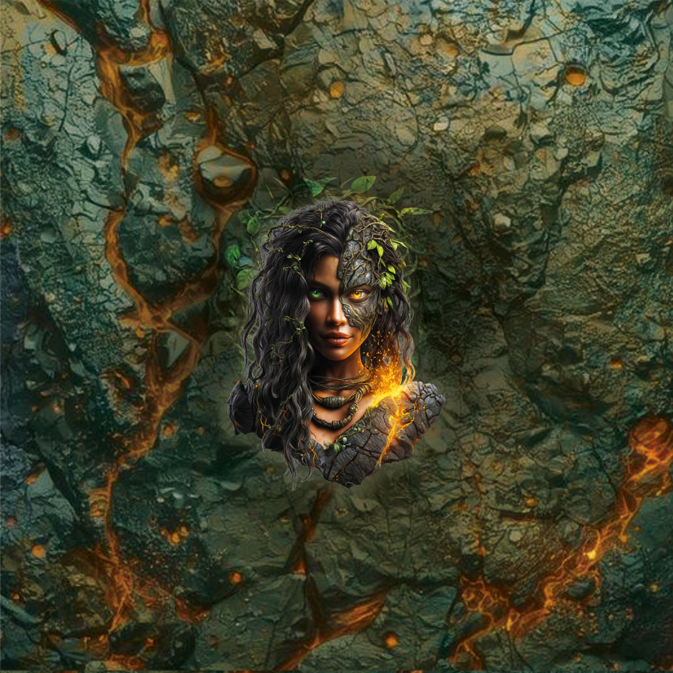 Motiv: mystische Natur-Fantasy-Figur mit Feuer- und Erd-Elementen