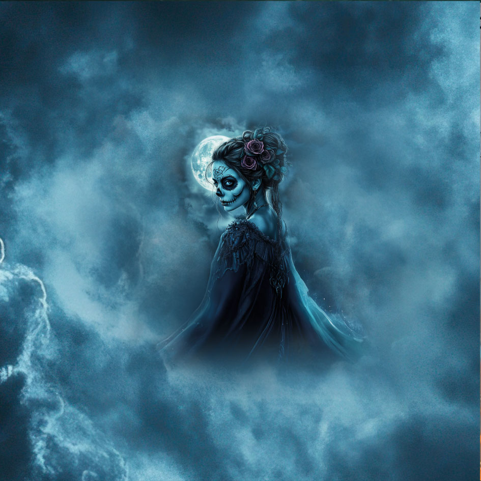 Dieses hochwertige Kunstleder-Set besteht aus zwei Paneelen à 40 × 40 cm und zeigt eine geheimnisvolle Catrina-Figur im Mondlicht, umgeben von dunklen Wolken und tiefen, violett-blauen Rosen. Das Motiv verbindet mexikanisch inspirierte Symbolik mit romantischer Dunkelheit und zeitloser Eleganz.