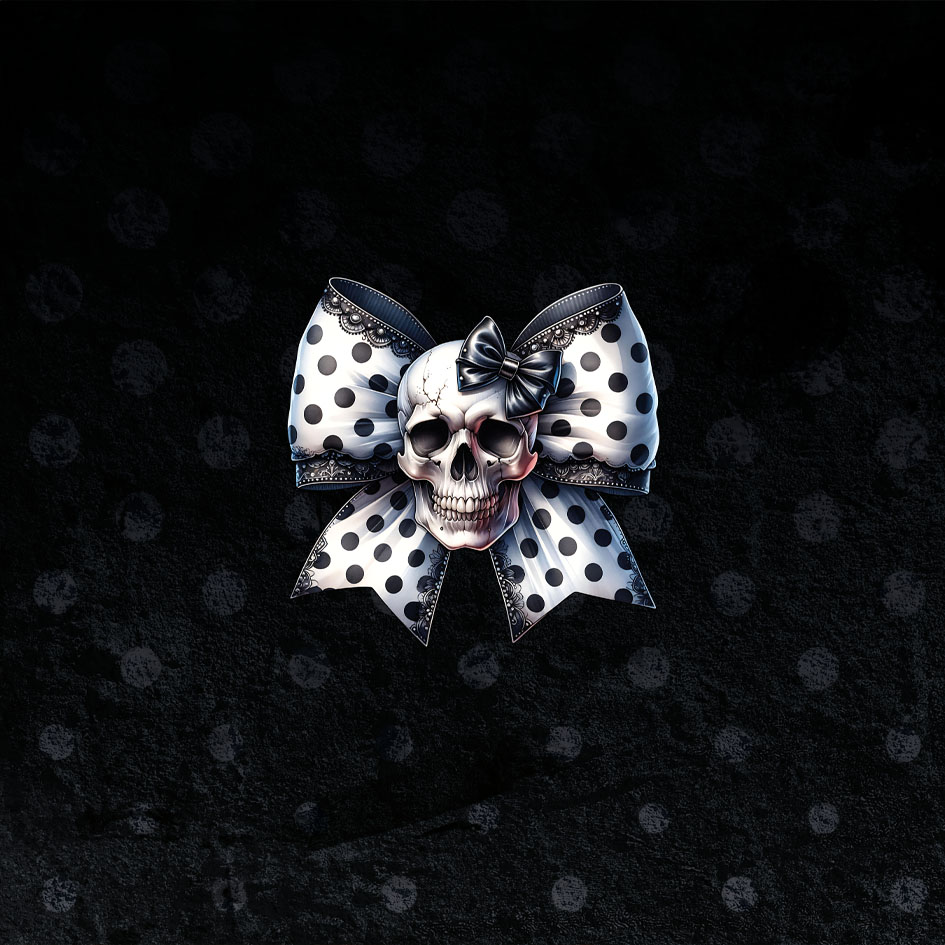Dieses hochwertige Kunstleder-Set besteht aus zwei Paneelen à 40 × 40 cm und zeigt einen markanten Totenkopf mit Schleife im Polka-Dot-Design. Der starke Kontrast aus Schwarz, Weiß und feinen Details verbindet Gothic-Ästhetik mit einer rebellischen, fast verspielten Eleganz.