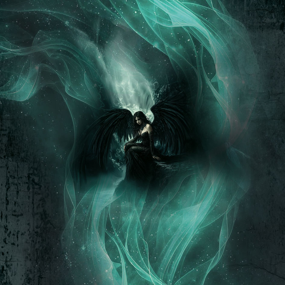 Dieses hochwertige Kunstleder-Set besteht aus zwei Paneelen à 40 × 40 cm und zeigt eine geheimnisvolle geflügelte Gestalt, umgeben von schimmernden, türkisfarbenen Nebelschleiern. Die dunklen Schwingen, das gedämpfte Licht und die fließenden Formen verleihen dem Motiv eine melancholische, fast träumerische Tiefe.