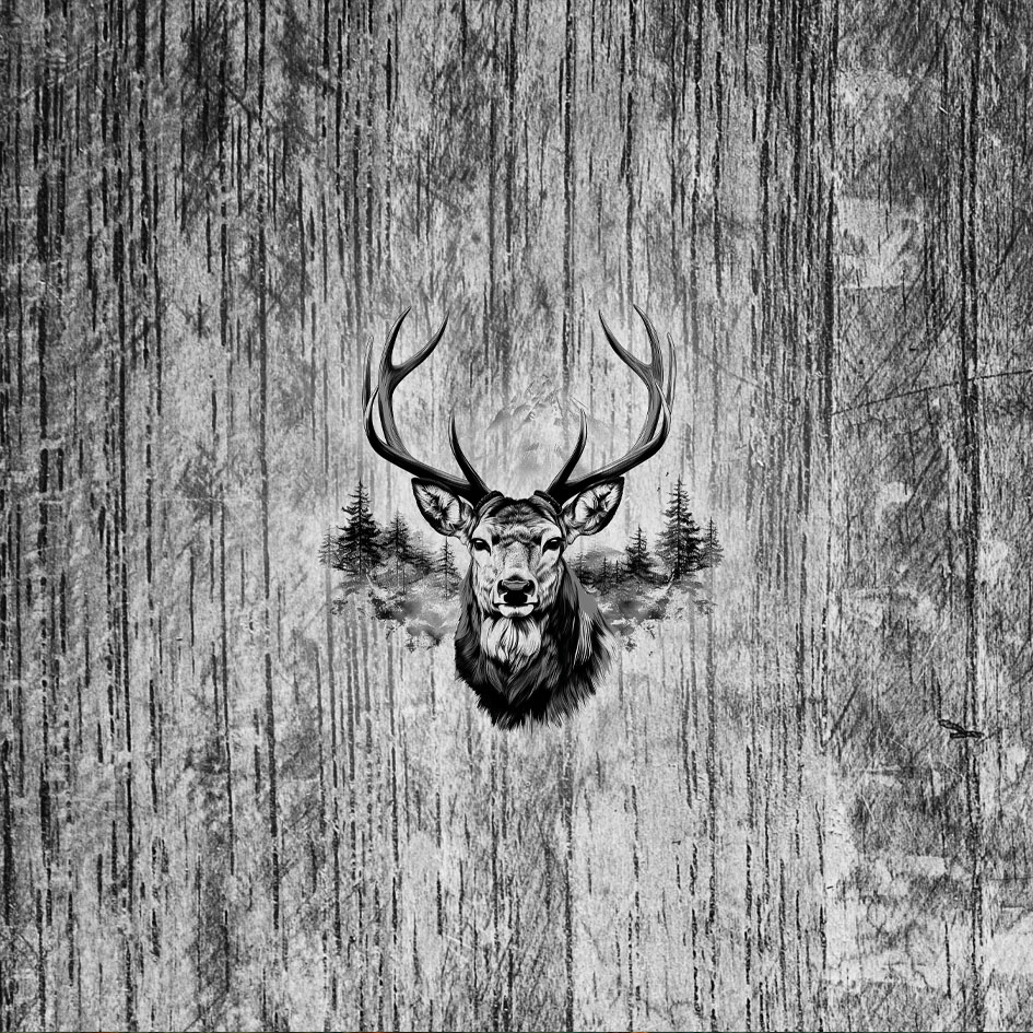 Dieses hochwertige Kunstleder-Set besteht aus zwei Paneelen à 40 × 40 cm und zeigt eine eindrucksvolle Waldlandschaft in sanften Grau- und Schwarztönen. Im Mittelpunkt steht ein majestätischer Hirsch, eingebettet in Nebel, Berge und Tannen – ein Motiv, das Ruhe, Stärke und Verbundenheit mit der Natur ausstrahlt.
