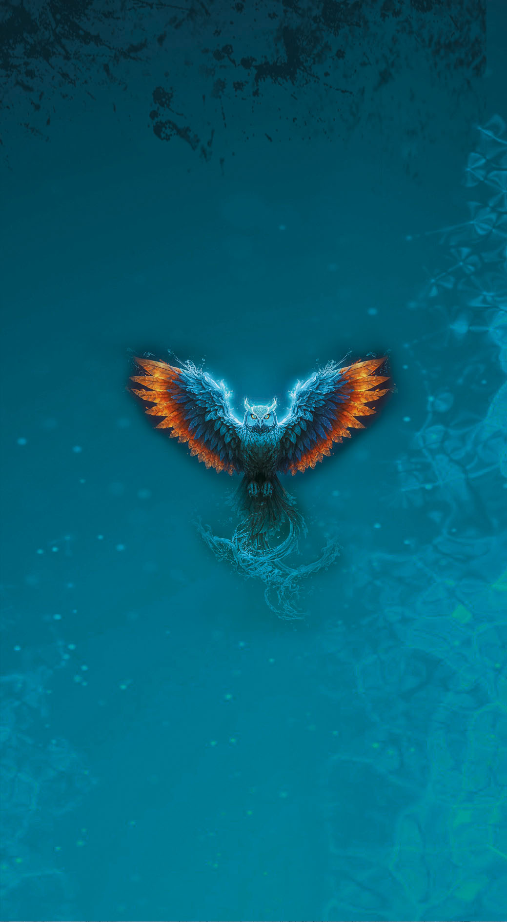 Ein kraftvolles Motiv voller Symbolik: Die Eule mit ausgebreiteten Flügeln scheint aus dem Wasser aufzusteigen. Leuchtende Blau- und Orangetöne treffen auf eine ruhige, fließende Umgebung und erzeugen ein Gefühl von Stärke, Freiheit und Klarheit.